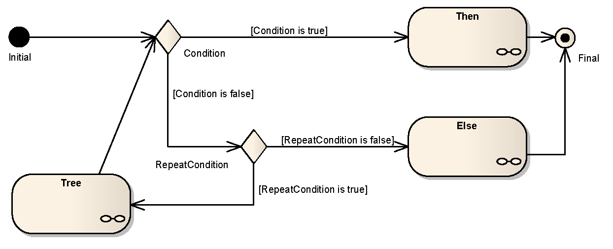 The IfUntil construct allows to define the branches’ execution according to certain conditions. The behavior is shown in Figure IfUntil as a state chart. This construct combines the functionality of a loop with the functionality of a condition element. The main purpose of this construct is that the Tree branch is executed until a defined condition is true. This condition is called Condition. If this Condition is true, the Then branch is executed. To restrict the number of repetitions, it is also possible to define another condition which specifies the possible repetitions. This condition is called RepeatCondition and defines the condition for the repetition. If the RepeatCondition is false, the Else branch is executed. After either the Then or the Else branch is finished, the execution of the IfUntil construct is finished.