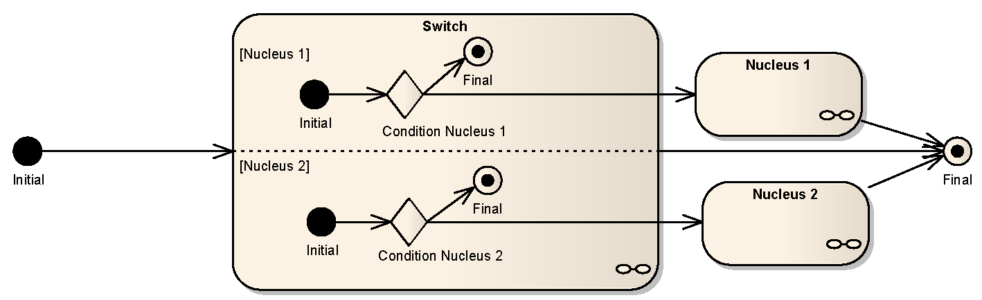 We use the Switch construct to model an exclusive or of branches in a Communication Model, which is shown as a state chart in Figure 5.11. This state chart has a combined state Switch, which has two regions. In each region a choice element is placed directly after the init state. This choice models the possibility that the corresponding nucleus should be executed or not depending on the internal state of one communication party. It is necessary to assign a specific communication party to the construct, which selects the nucleus to be executed by evaluating the corresponding conditions at run-time. Because the combined state for each nucleus is outside of the Switch state, it is only possible to enter and execute the sub state machine of one of the nuclei states. An additional constraint for the Switch relation is, that in all situations exactly one nucleus has to be executed. The number of nuclei is not limited to 2 by this definition.