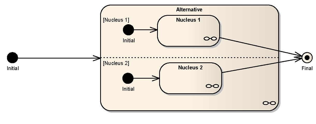 Figure Alternative shows the behavior as a state chart. In this state chart the nuclei states are inside the Alternative composite state. This allows that more than one nucleus can be executed at the same time. To model that only one nucleus can be executed until its