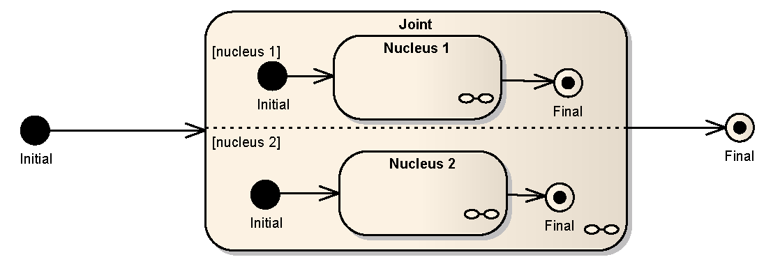 For the use in our Communication Model we defined a Joint relation as follows. The related branches representing the nuclei have to be executed quasi-parallel. In this context this means, that all branches have to be fully executed, but without any specific order, or a parallel. An example for a Joint relation is the relation of the selection of a departure airport and the selection of a destination airport in our FlightBooking example. The Joint relation allows that both questions can be uttered at the same time, but it is also possible to start with only one question and to utter the second one after the first one is answered. After all branches are executed the final states are reached, the Joint’s execution is finished. The Procedural Semantics is shown in Figure Joint as as state chart with two nuclei. The Nucleus x states in the state charts represent the composite states for the nuclei. If there are more than two nuclei modeled, additional regions inside the Joint state are created for each nucleus. These regions have the same structure as the two regions shown in the Joint state.